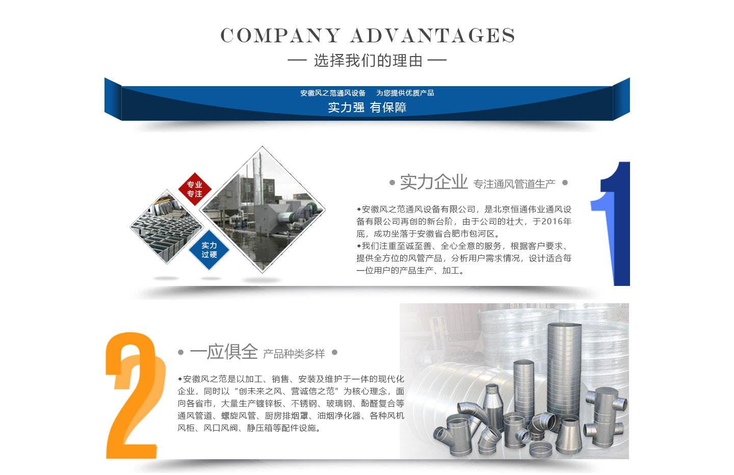 安徽風(fēng)之范通風(fēng)設(shè)備有限公司,是北京恒通偉業(yè)通風(fēng)設(shè)備有限公司再創(chuàng)的新臺(tái)階,多年來(lái),公司員工憑著“誠(chéng)信敬業(yè)、團(tuán)結(jié)拼搏、勇于開(kāi)拓、務(wù)實(shí)進(jìn)取”的企業(yè)精神,先后承接了多項(xiàng)重點(diǎn)工程項(xiàng)目,使公司健康穩(wěn)步發(fā)展。現(xiàn)由于公司的壯大,業(yè)務(wù)的拓展,又于2016年底,成功坐落于安徽省合肥市包河區(qū)。本公司生產(chǎn)設(shè)備精良,技術(shù)力量雄厚,質(zhì)保體系完善!讓用戶(hù)體驗(yàn)到,貼心的服務(wù),無(wú)憂(yōu)的售后!風(fēng)之范是以加工、銷(xiāo)售、安裝及維護(hù)于一體的現(xiàn)代化企業(yè),同時(shí)以“創(chuàng)未來(lái)之風(fēng)、營(yíng)誠(chéng)信之范”為核心理念,面向全國(guó)各省市,大量生產(chǎn)鍍鋅板、不銹鋼、玻璃鋼、酚醛復(fù)合等通風(fēng)管道、螺旋風(fēng)管、廚房排煙罩、油煙凈化器、各種風(fēng)機(jī)風(fēng)柜、風(fēng)口風(fēng)閥、靜壓箱等配件設(shè)施。廣泛承接商場(chǎng)、工廠(chǎng)、酒店、寫(xiě)字樓、地下室等,消防排煙工程、除塵凈化工程、室內(nèi)通風(fēng)工程、暖通空調(diào)工程、廚房排煙凈化工程。我們力求上進(jìn),追求,歡迎各界人士技術(shù)指導(dǎo),經(jīng)濟(jì)合作,共創(chuàng)美好明天!